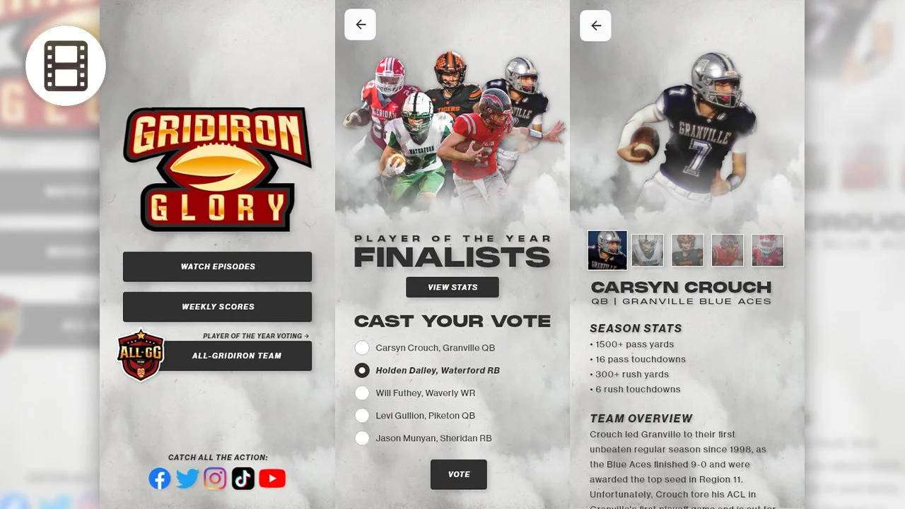 For the last two seasons of Gridiron Glory, I helped implement an all-new campaign called the “All-GG Team” — which recognizes 50 of the best high school football players from across the region. As part of the buildup to the reveal, we open voting to the fans for one Player of the Year. And although voting takes place on the WOUB website, it’s been my vision to create a comprehensive hub for all the voting, information, and footage for Player of the Year finalists, Coach of the Year nominees, and All-GG team members. These wireframes were created in Adobe XD to fulfill that vision.